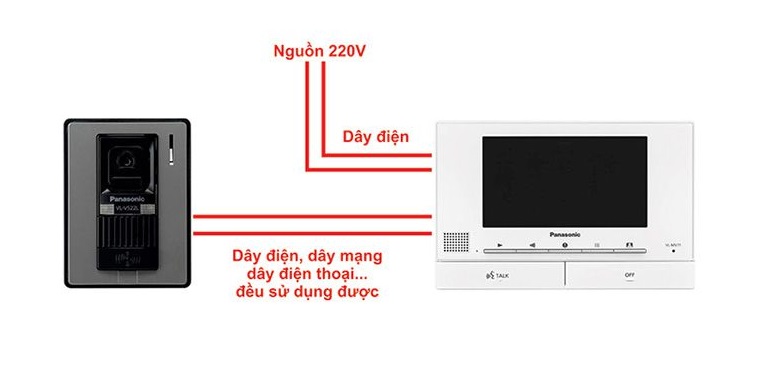 – Kết nối giữa màn hình và camera chuông cửa bằng 2 sợi dây (lắp đặt dễ dàng có thể dùng dây điện dây mạng hoặc dây line điện thoại có sẵn).