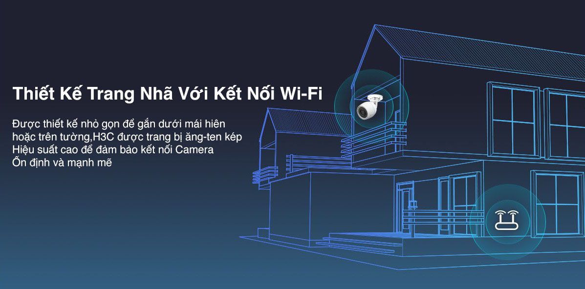 - Được thiết kế nhỏ gọn để gắn dưới mái hiên hoặc trên tường, H3c được trang bị ăng-ten kép độ lợi cao. Hiệu suất cao để đảm bảo kết nối Camera