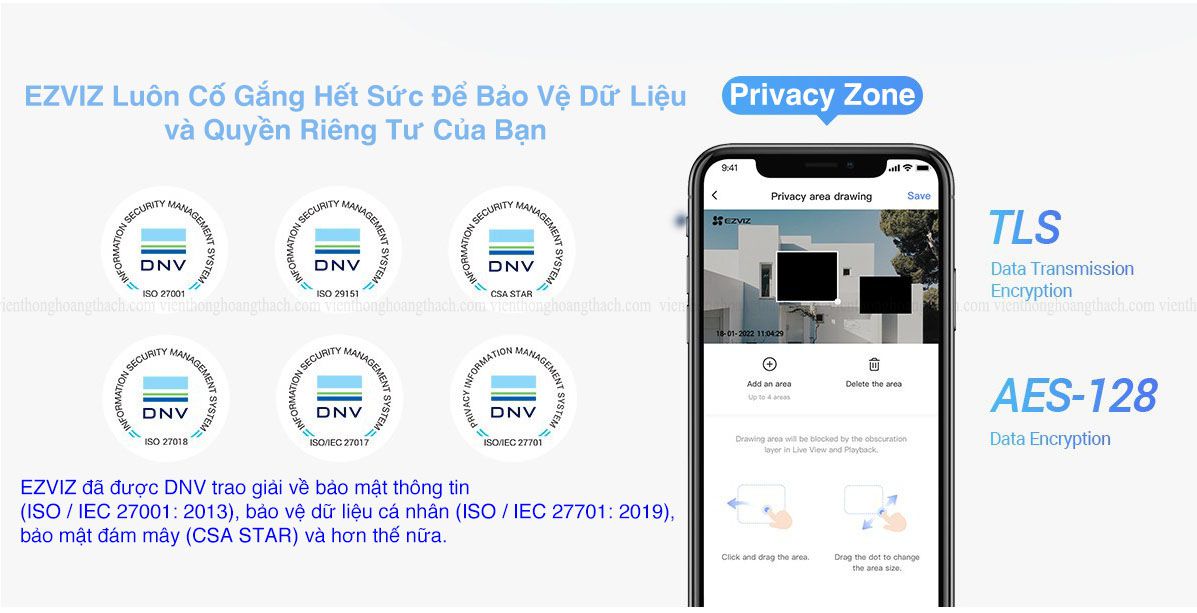 - EZVIZ đã được DNV trao giải về bảo mật thông tin (ISO / IEC 27001: 2013), bảo vệ dữ liệu cá nhân (ISO / IEC 27701: 2019), bảo mật đám mây (CSaA STAR) và hơn thế nữ