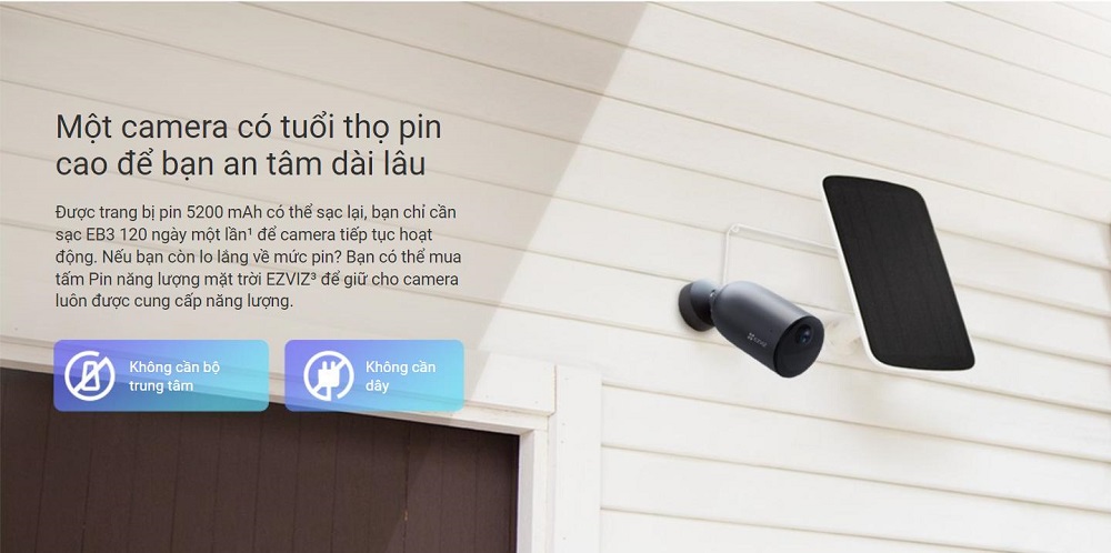 Camera WiFi Dùng Pin Ngoài Trời EZVIZ EB3 2K là camera Wifi an ninh ngoài trời cực kỳ dễ sử dụng với độ phân giải 2K rõ nét và nhiều tính năng khác. Camera hoạt động liên tục và ổn định lên đến 120 ngày chỉ với một lần sạc đầy pin, và về cơ bản camera này có thể được lắp đặt ở bất kỳ đâu gần nhà bạn mà không cần đi dây phức tạp hoặc chi phí lắp đặt đắt đỏ. Đây là một lựa chọn phù hợp, giá phải chăng cho bất kỳ gia đình nào cần thêm một lớp bảo vệ.