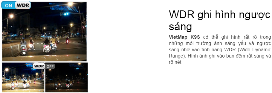 - VietMap K9S có thể ghi hình rất rõ trong những môi trường ánh sáng yếu và ngược sáng nhờ vào tính năng WDR (Wide Dynamic Range). Hình ảnh ghi vào ban đêm rất sáng và rõ nét