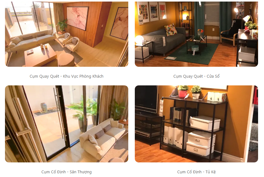 - Cảnh 1, ban công hay phòng khách, Cảnh 2, kệ siêu thị, Cảnh 3, căng tin nhà hàng , Cảnh 4, hành lang thang máy