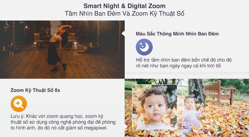 - Chế độ ban đêm thông minh với 4 chế độ sáng: Tự động, Full Color, Hồng ngoại và tắt.