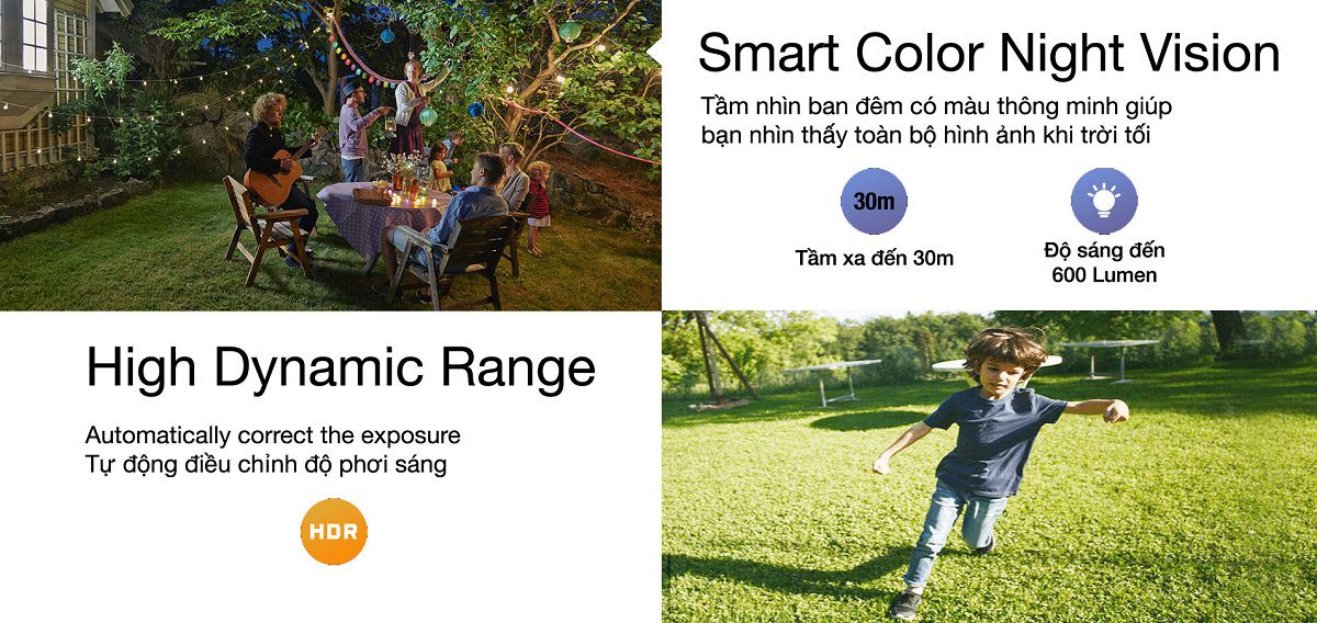Tầm nhìn ban đêm có màu thông minh giúp bạn quan sát toàn bộ khung cảnh khi trời trới . Tầm xa đến 30M với đèn LED có độ sáng 600 Lumen