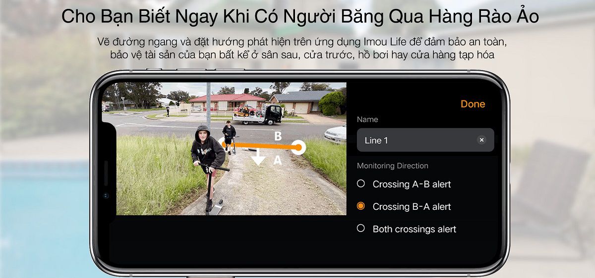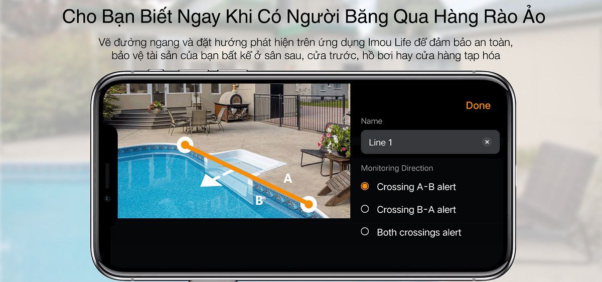 Vẽ đường ngang và đặt hướng phát hiện trên ứng dụng Imou Life để đảm bảo an toàn, Bảo vệ tài sản của bạn bất kể ở sân sau, cửa trước, hồ bơi hay cửa hàng tạp hóa