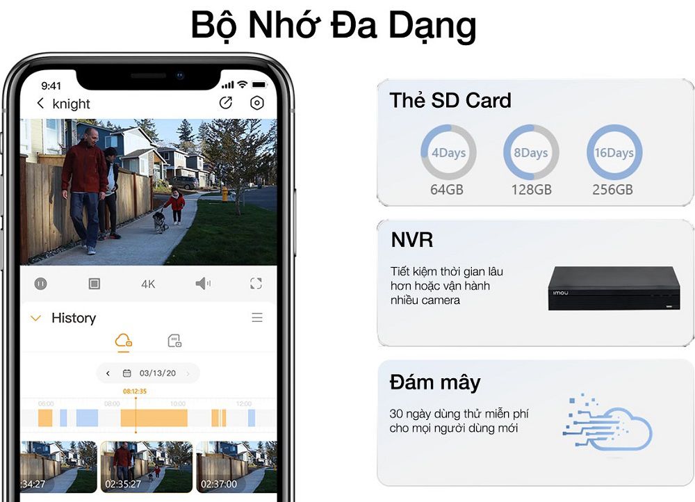 - Bộ nhớ đa dạng Hỗ trợ lưu trữ đám mây hoặc thẻ Micro SD (lên đến 256GB)