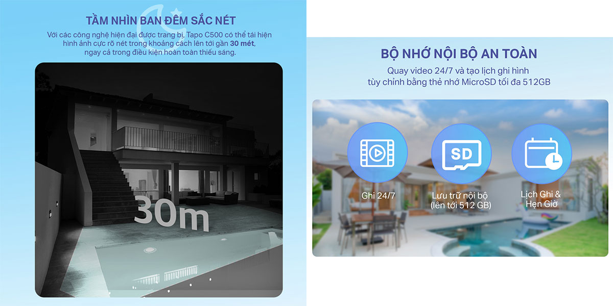 Về khả năng lưu trữ, camera hỗ trợ MicroSD lên đến 512GB và có khả năng lưu nội bộ qua phần mềm Tapo Care.