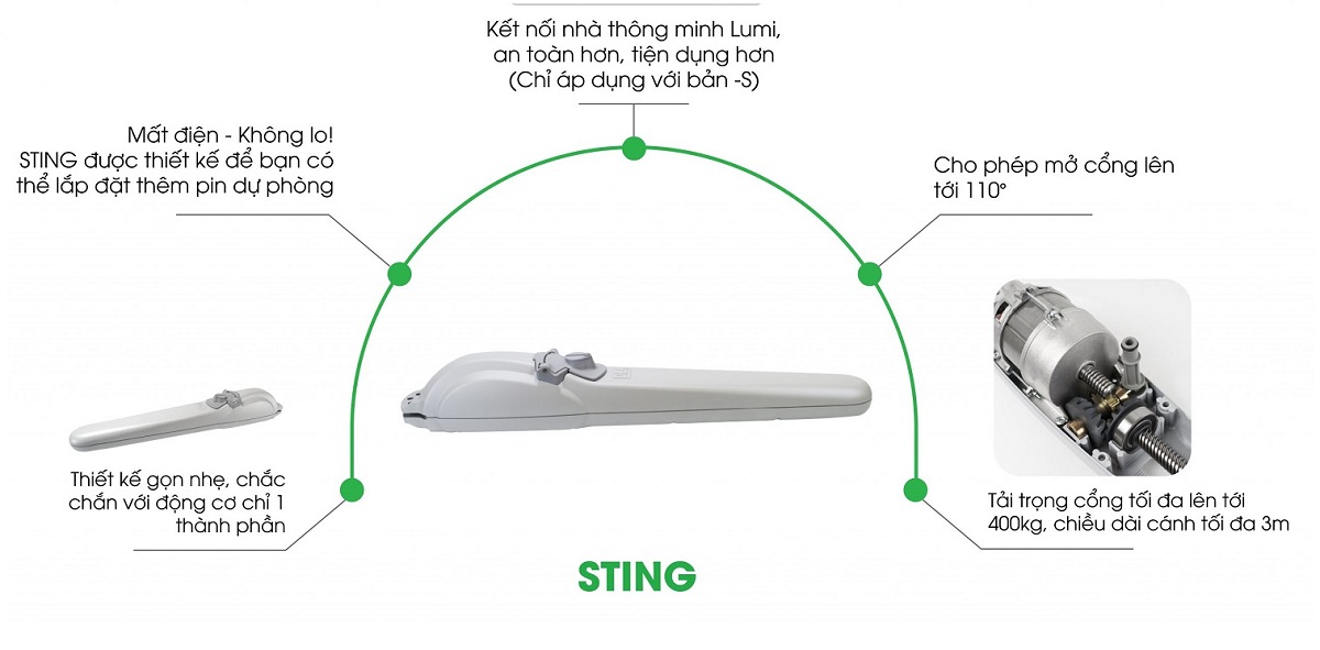 Thiết kế chắc chắn: Cổng tự động STING được thiết kế với động cơ chỉ 1 thành phần, tạo nên một hệ thống chắc chắn và ổn định.Từ đó mang đến hiệu suất hoạt động cao và độ bền lâu dài của cổng.