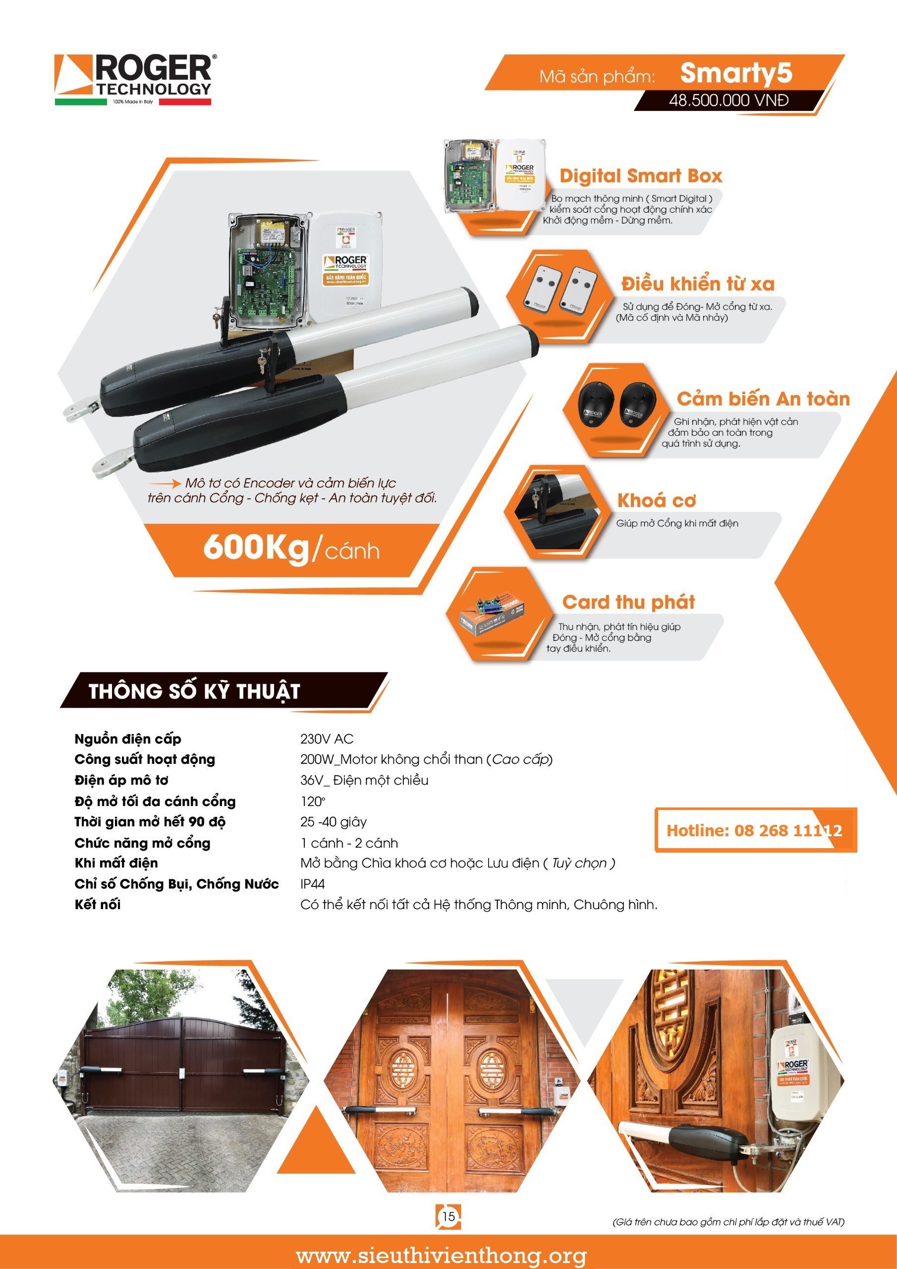 - Motor cánh tay đòn Roger Smarty 5 được trang bị động cơ 200W, tạo ra lực đầy từ 600 đến 7000N. Nó giúp vận hành cho những loại cửa, cổng có tải trọng tối đa: 600 kg /cánh (nếu cửa nặng hơn đã có Motor Roger Smarty 7 )