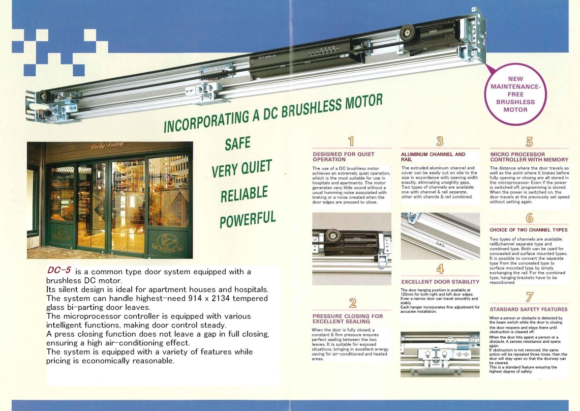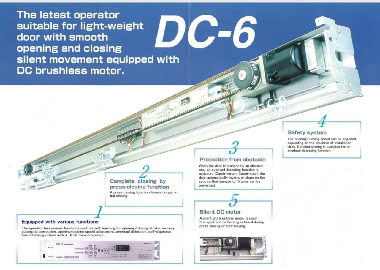 - Được trang bị nhiều chức năng khác nhau: Cửa tự động DC6 được trang bị board mạch sử dụng công nghệ lập trình micro-computer 16 bit (các nhãn hiệu cửa tự động khác chỉ sử dụng 8 bit). Do đó, DC6 được trang bị nhiều chức năng khác nhau như tự động dò tìm và ghi nhớ hành trình, phanh giảm tốc, chức năng ghi nhớ dữ liệu, tự động sửa lỗi, điều chỉnh linh hoạt tốc độ đóng mở cửa, phát hiện và bảo vệ tình trạng quá tải, tự động chẩn đoán lỗi và báo động…