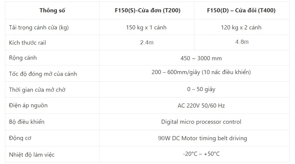 - MOTOR: Được thiết kế và sản xuất đồng bộ tại Hàn Quốc, đây là loại mô tơ điện một chiều cho phép cửa hoạt động với tần suất cao mà không bị nóng. Với moment xoắn lớn cộng với hệ thống gá được chế tạo đặc biệt giúp cho sự vận hành của cửa hết sức nhẹ nhàng không bị rung. Tải trọng tối đa cho 02 cánh cửa lên tới 240 kg hoặc 150 kg cho cửa 1 cánh.