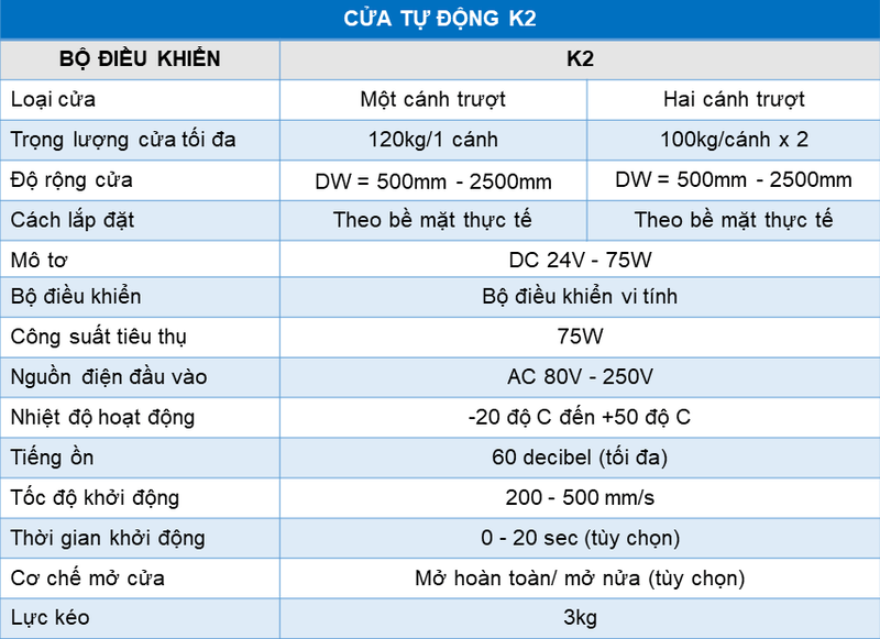 III. Thông số kỹ thuật cửa tự động Zamilldoor K2: