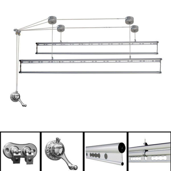 Buli chính hãng: Mỗi bộ giàn phơi sẽ có 4 buly. Tác dụng của buly là để dẫn động dây cáp và treo thanh phơi phía bên dưới. Buly thường được làm từ hợp kim không ghỉ và được gắn cố định trên trần bằng bulong nở sắt. Ngoài ra còn có dẫn hướng để thay đẩy phương truyền lực từ bộ tời đến các buly dẫn động.