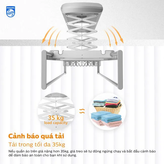 - Cảnh báo quá tải: Khi phơi quần áo quá số cân nặng cho phép, giàn phơi sẽ phát ra âm thanh cảnh báo.
