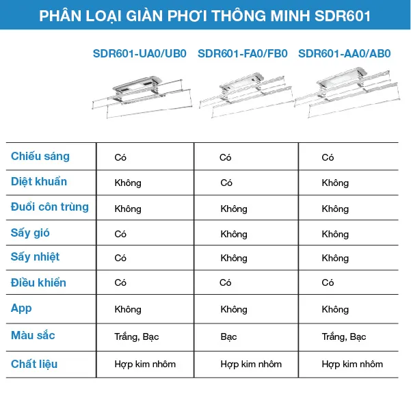 - Đặc biệt, với thiết kế 4 thanh phơi, SDR601 sở hữu một không gian phơi đồ rất thoải mái, phù hợp cho cả gia đình.