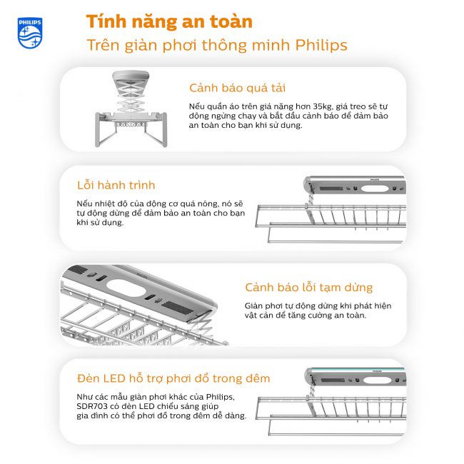 - Cảnh báo quá tải: Khi phơi quần áo quá số cân nặng cho phép, giàn phơi sẽ phát ra âm thanh cảnh báo.