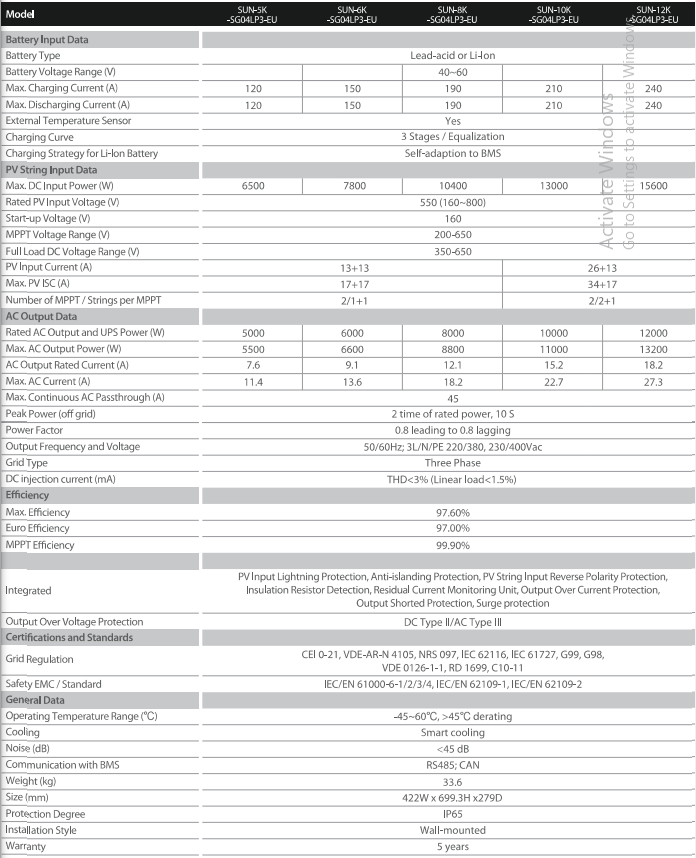 Thông số kỹ thuật Inverter Hybrid Deye 12kW SUN-12K-LP3-EU-AM2