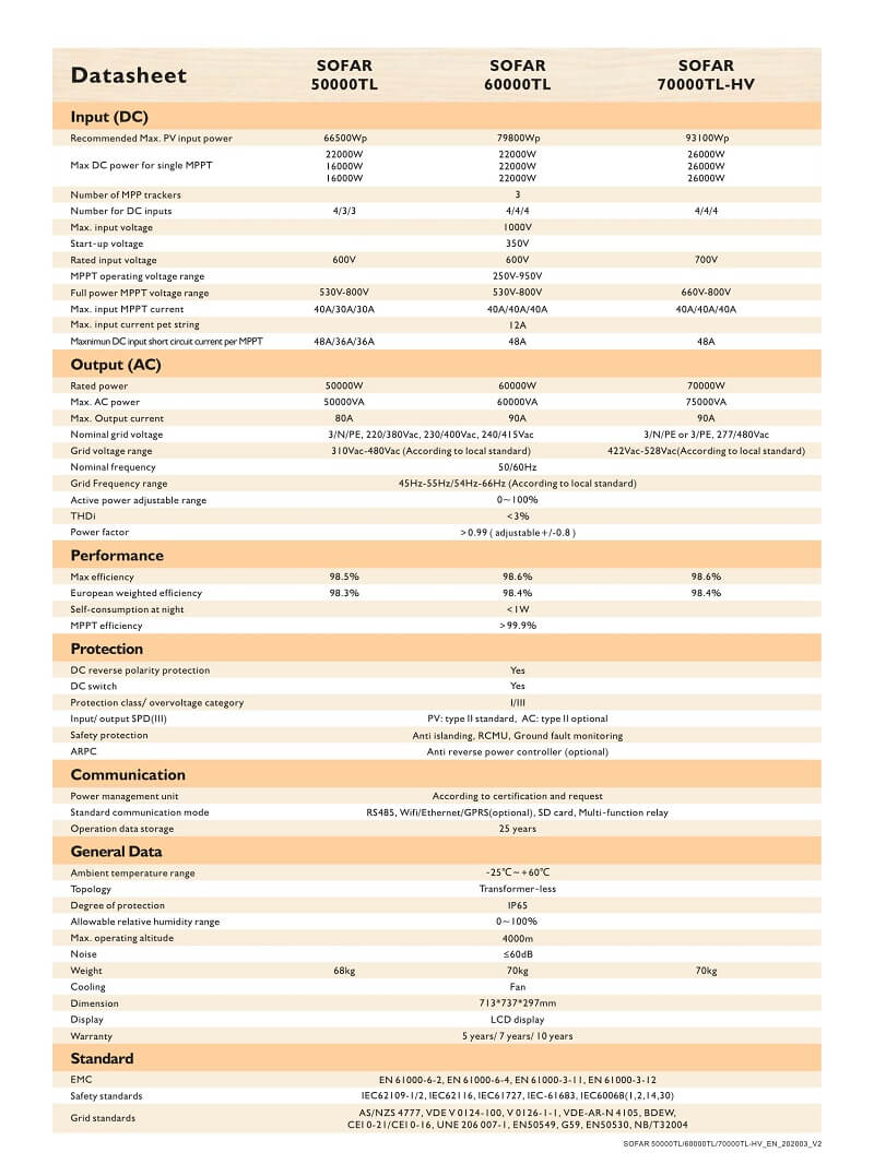 Thông số kỹ thuật Inverter Hòa Lưới Sofar 50kW 50000TL