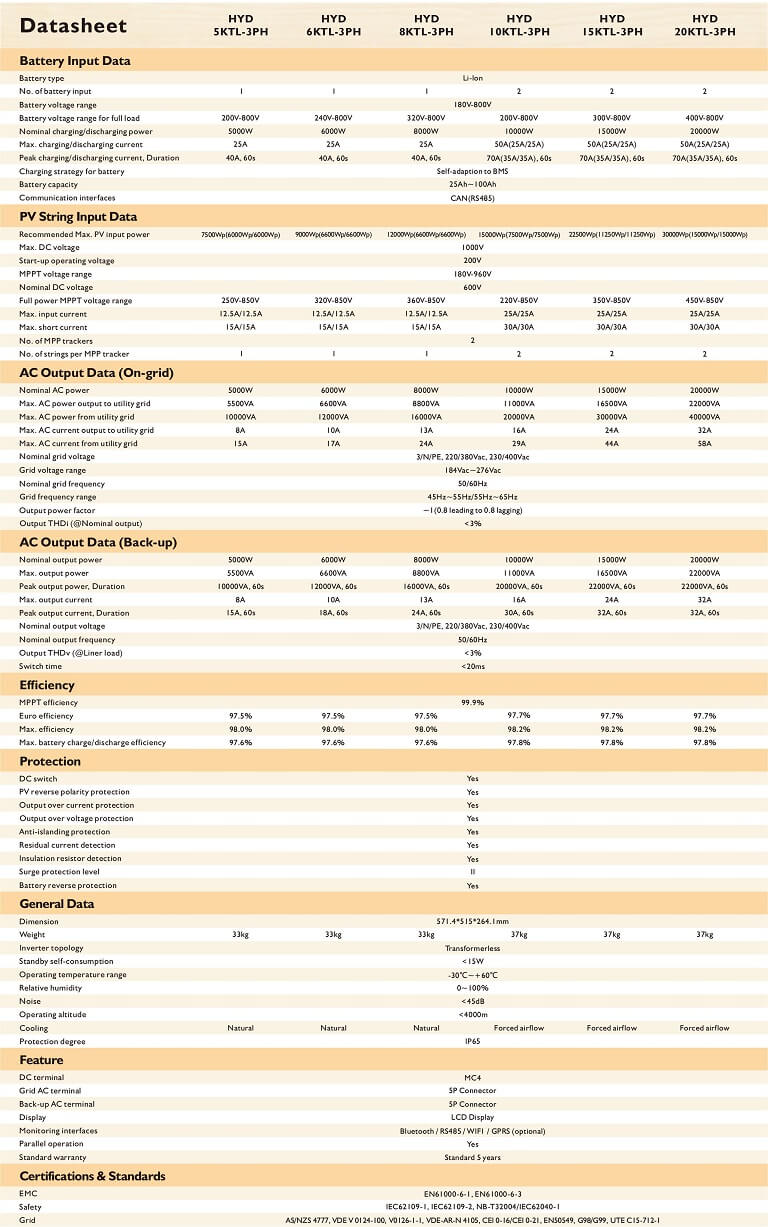 Thông số kỹ thuật Inverter Hybrid Sofar 15kW HYD 15KTL-3PH