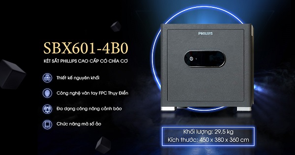 Két sắt điện tử Philips SBX601-4B0 là mẫu két sắt thông minh mở khóa hoàn toàn bằng các phương thức điện tử. Không cần dùng tới chìa cơ, SBX601 sử dụng các nghệ mở khóa hiện đại: vân tay và mã số.