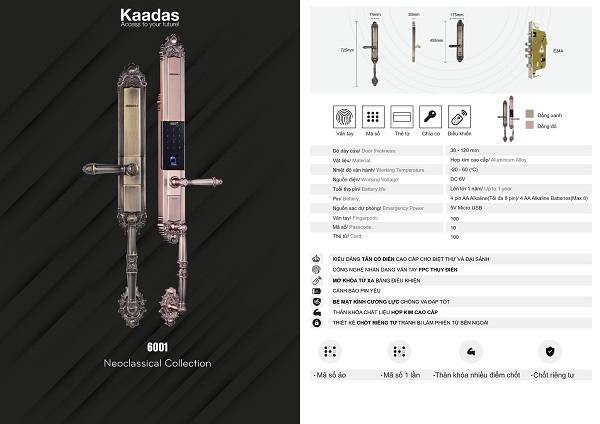 Thông số kỹ thuật Khóa cửa vân tay Kaadas 6001