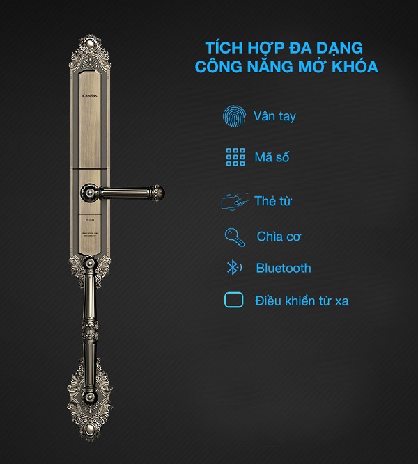 - Vân tay / Mật khẩu /Thẻ từ/ Khóa cơ / Smart phone Bluetooth