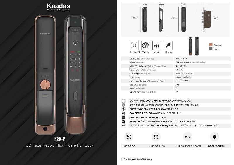 - Kaadas K20-F có mở khóa bằng: khuôn mặt, vân tay, mã số, chìa cơ. Đăng ký tối đa được 20 khuôn mặt, 100 vân tay, 1 mã số chủ, 5 mã số người dùng, 5 mã số khách (dùng 1 lần). Có sẵn: 2 chìa cơ