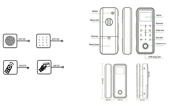 - Kiểu mở khóa: Vân tay, Thẻ từ, Mã số, App TTLock (Smartphone)