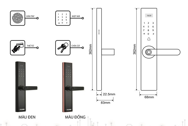 Khoá có 2 màu sắc lựa chọn là viền đen và vàng đồng. Mặt kính kính cường lực đen chống xước giúp bề ngoài của khoá hiện đại và công nghệ.