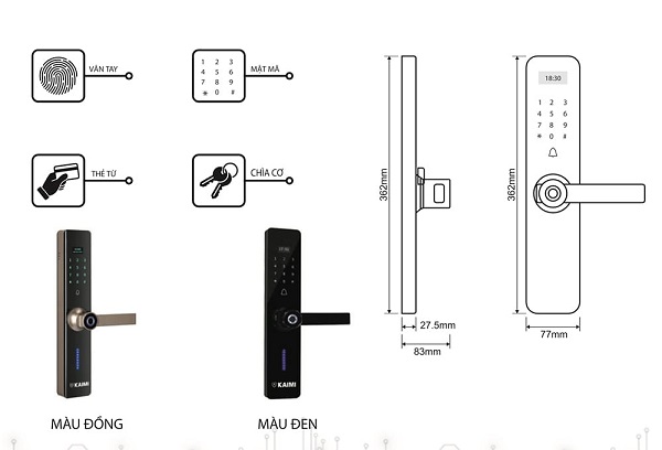 Màu sắc: Khoá có 2 màu lựa chọn bao gồm mặt kính đen và viền đen, mặt kính đen và viền vàng.