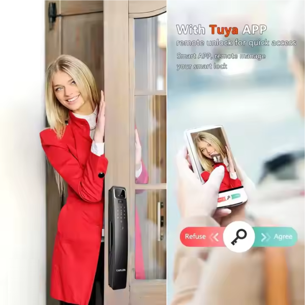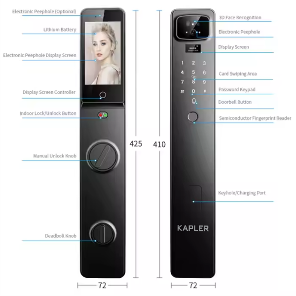 Khóa thông minh Kapler KL-820F với tính năng mở cửa hiện đại 7 trong 1, nhận diện gương mặt (Face ID), mở khóa từ xa qua điện thoại (App Tuya), vân Tay, thẻ Từ, mã Số và chìa cơ, dung lượng đăng ký lớn 100 Face Id, 295 (Vân tay,thẻ từ,mã số), 5 admin.