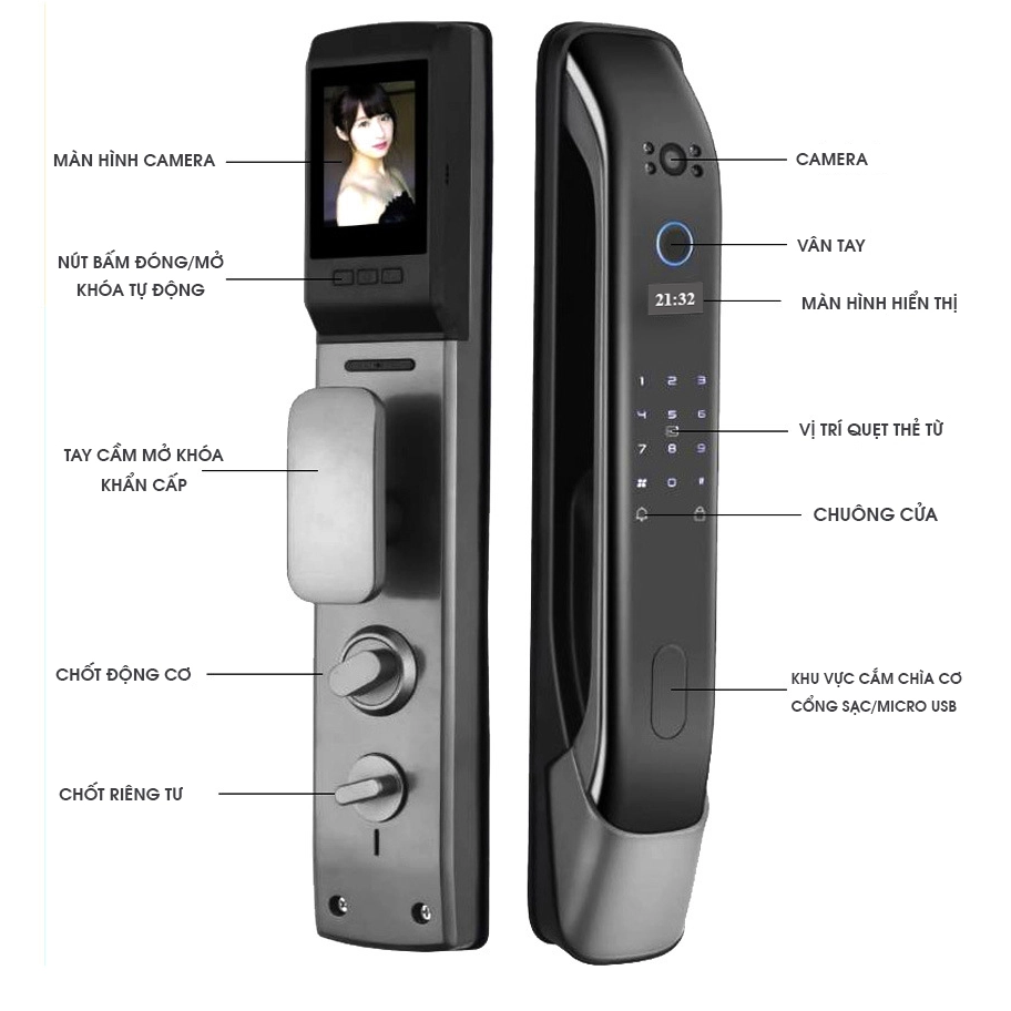 - Kiểu mở khóa đa dạng: Vân Tay, Thẻ Từ, Mã số và chìa cơ. Kết hợp Camera (chuông cửa màn hình) theo dõi từ bên trong nhà