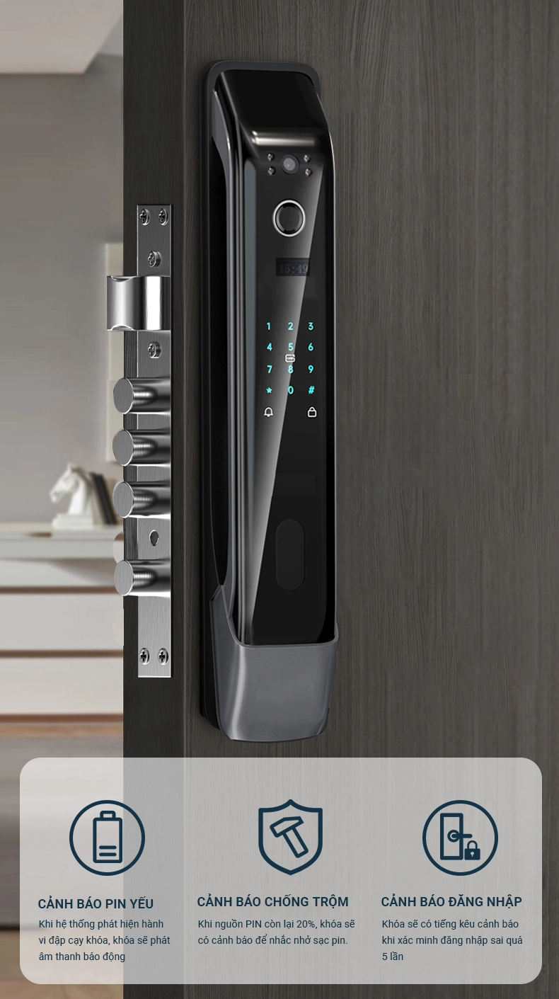 - Cảnh báo phá hoại: Khi có tác động phá cửa từ bên ngoài, chuông cảnh báo được lắp đặt trong khóa cửa sẽ vang lên