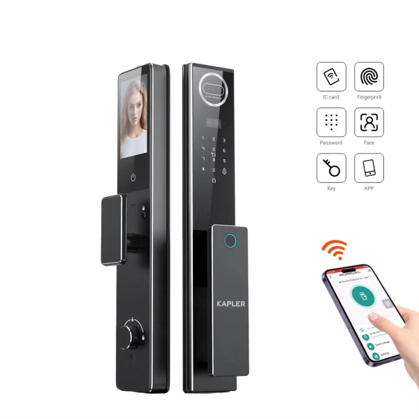 Khóa thông minh Kapler KL-810F với tính năng mở cửa hiện đại 7 trong 1, nhận diện gương mặt (Face ID), mở khóa từ xa qua điện thoại (App Tuya), vân Tay, thẻ Từ, mã Số và chìa cơ, dung lượng đăng ký lớn 100 Face Id, 295 (Vân tay,thẻ từ,mã số), 5 admin.