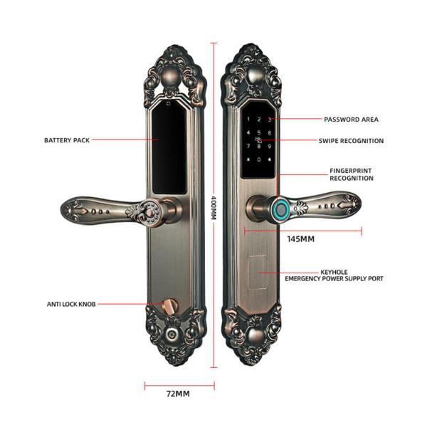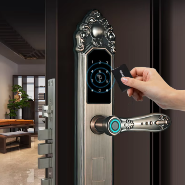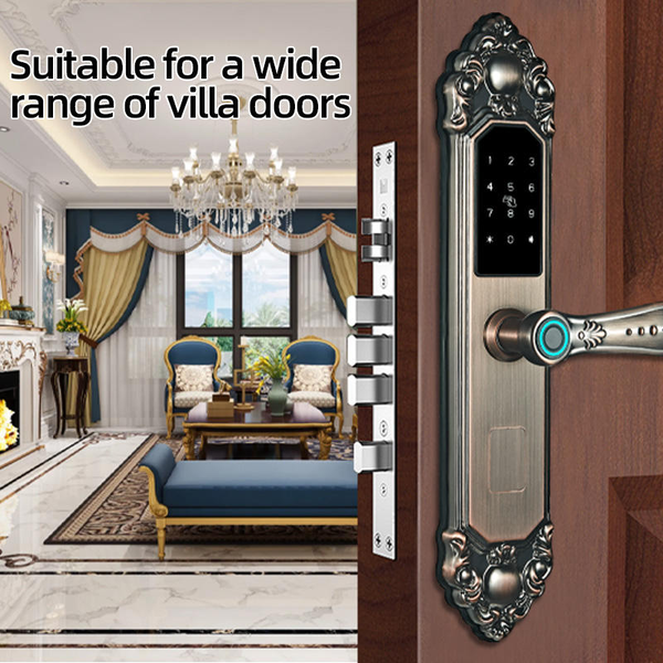Thiết kế sang trọng mang tới vẻ lịch lãm cho ngôi nhà của bạn với 5 chức năng phong phú: Mở khóa bằng vân tay vân tay FPC thụy điển, mở khóa bằng mật mã cho phép cài đặt mã số ảo chống nhìn trộm, Mở khóa bằng thẻ từ IC, mở khoá bằng App Bluetooth, chìa khóa Vật Lý chìa khóa chống sao chép.