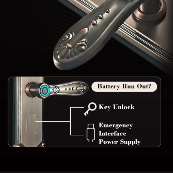 Mở khóa bằng chìa cơ: Khóa hỗ trợ chức năng mở cửa bàng chìa cơ và cổng cấp nguồn dự phòng trong trường hợp khi đi xa lâu ngày bị hêt pin, hoặc mở cửa khi cần thiết.