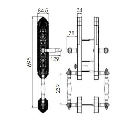+ Kích thước thân khóa ngoài: R84,5 x C710 x D35 mm