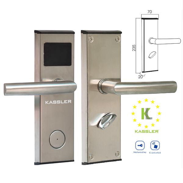 - Trọn bộ Khóa cửa điện tử Kassler KL-383I gồm: 1 thẻ từ, 2 chìa cơ