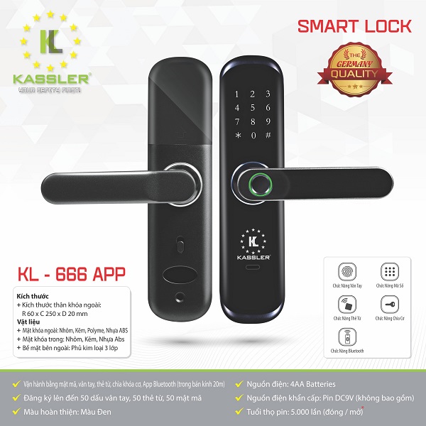 - Khóa cửa vân tay Kassler KL-666 hoạt động bằng vân tay, mật mã, thẻ từ, chìa khóa cơ, APP Bluetooth