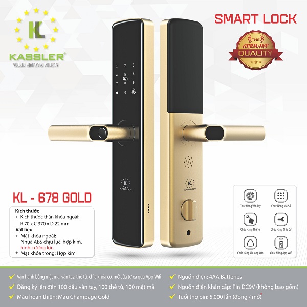 Thông số kỹ thuật khóa cửa vân tay Kassler KL-678 Gold