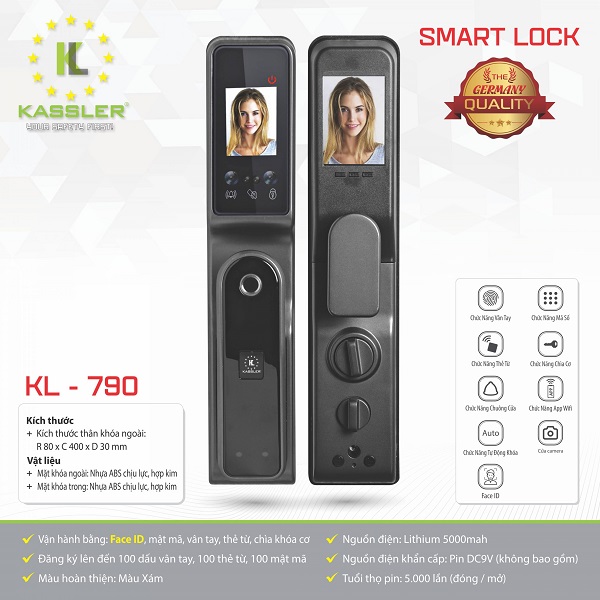 ♦ Khóa cửa vân tay Kassler KL-790 mở khóa nhận dạng khuôn mặt ( Face ID)