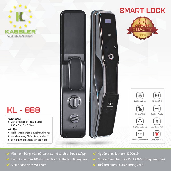 Thông số kỹ thuật Khóa cửa vân tay Kassler KL-868 App