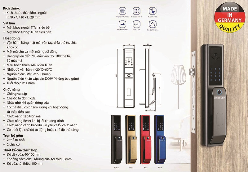 Thông số kỹ thuật Khóa cửa vân tay Kassler KL-888
