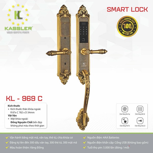 Khóa cửa vân tay Kassler KL-969C đang được bình chọn là thiết bị an toàn nhất hiện nay cho cửa nhà, với tính năng không thể cạy phá bẻ cong bằng ngoại lực và bảo mật nhờ công nghệ vượt trội như mở khóa thông minh, cảnh báo chuông.... giúp ngôi nhà không chỉ trở lên sang trọng mà con tuyệt đối an toàn.