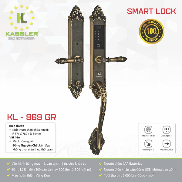 Khóa cửa vân tay Kassler KL-969GR đang được bình chọn là thiết bị an toàn nhất hiện nay cho cửa nhà, với tính năng không thể cạy phá bẻ cong bằng ngoại lực và bảo mật nhờ công nghệ vượt trội như mở khóa thông minh, cảnh báo chuông.... giúp ngôi nhà không chỉ trở lên sang trọng mà con tuyệt đối an toàn.