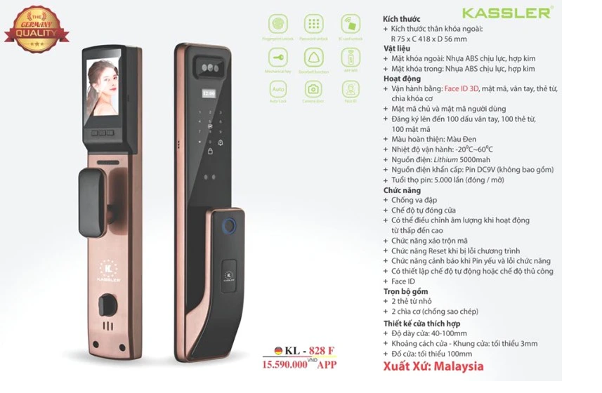 Kassler KL-828F là khóa cao cấp thương hiệu Đức với ngoại quan đẹp và sang trọng. Được trang bị những công nghệ mới nhất như mở khóa bằng nhận diện khuôn mặt 3D, và chuông hình ngay trên khóa