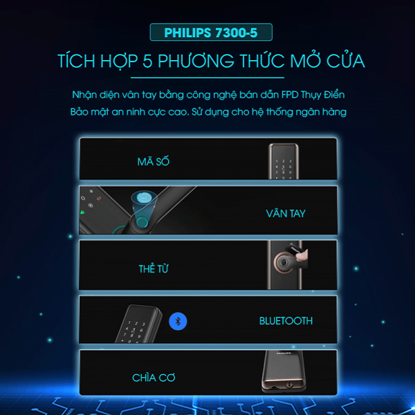 Khóa cửa vân tay Philips 7300-5 cho phép người dùng mở khóa bằng 5 phương thức mở: vân tay, thẻ từ, mã số, chìa cơ và Bluetooth.