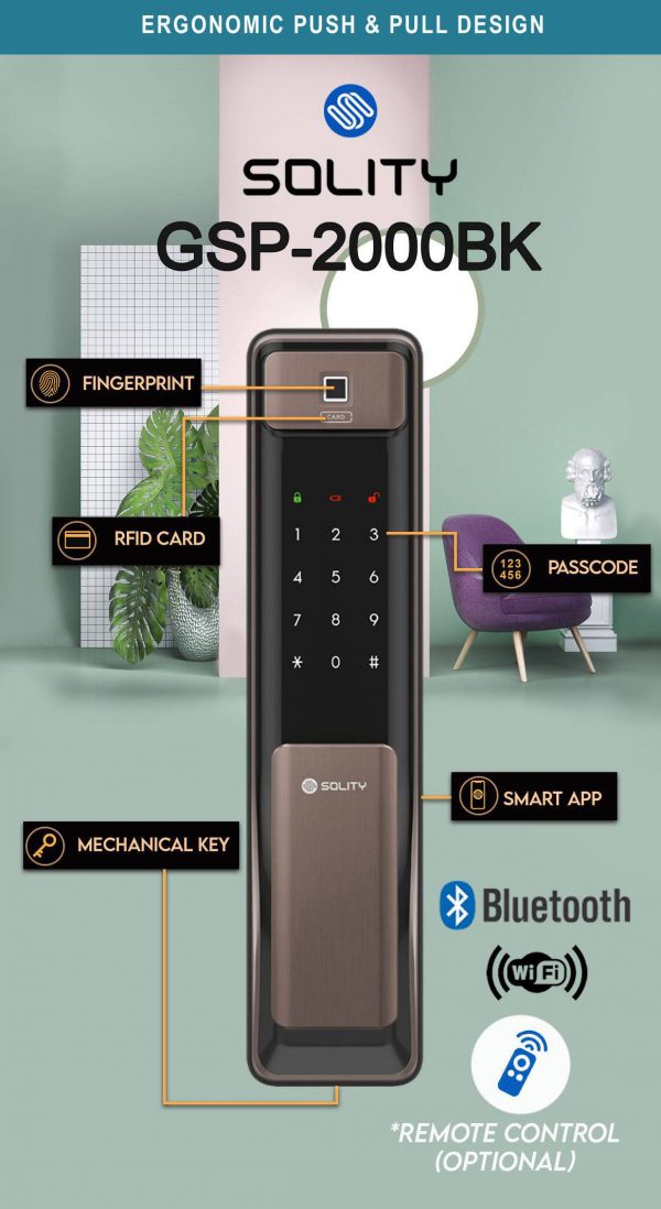 Solity GSP-2000BK phiên bản Push & Pull với kiểu dáng đơn giản nhưng tinh tế, màu sắc chủ đạo là màu bạc sang trọng, đem đến vẻ ngoài cứng cáp, chắc chắn, liền mạch. Các đường viền được bo cong tự nhiên, khỏe khoắn, đẳng cấp. Bộ phận tay cầm và thân khóa được phủ lớp sơn nhám giúp thao tác mở, đóng cửa thoải mái hơn, chắc chắn sẽ đem lại sự hài lòng cho mọi khách hàng khóa tính nhất.