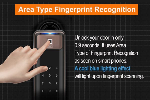 a. Mở khóa vân tay: Thuật toán vân tay thông minh nhân tạo kết hợp với chip xử lý công nghệ cao hiện đại bậc nhất cho khả năng nhận diện chính xác đến 98.96%, dữ liệu nội bộ được lưu trữ trong khu vực an toàn và độc lập. Thiết kế phím cảm ứng vân tay được tích hợp tự nhiên mặt trước tay cầm. Do vậy, bạn có thể dễ dàng chạm dầu ngón tay để xác nhận vân tay, sau đó đẩy hoặc kéo nhẹ tay nắm góc 15 độ để mở khóa.