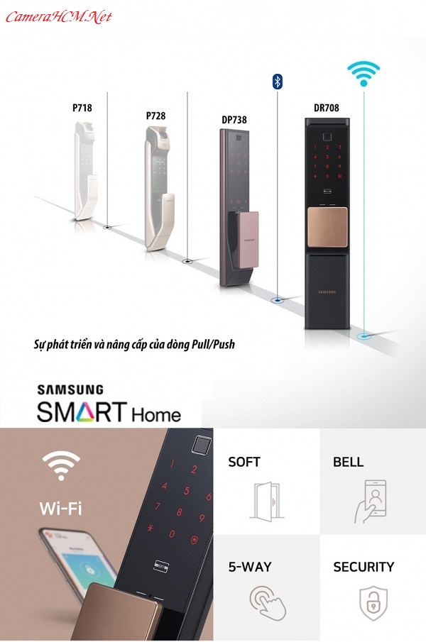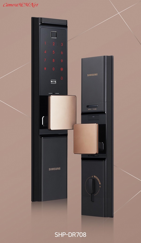 Khóa cửa thông minh Samsung SHP-DR708 là sản phẩm mới nhất của Samsung tính đến thời điểm hiện nay. Thiết kế vẫn giữ nguyên cơ cấu mở khóa Đẩy/kéo, nhưng đã cái tiến công nghệ để nó trở nên tiện dụng và tinh sảo hơn so với những model cũ như: SHS-P718 hoặc SHP-DP728.